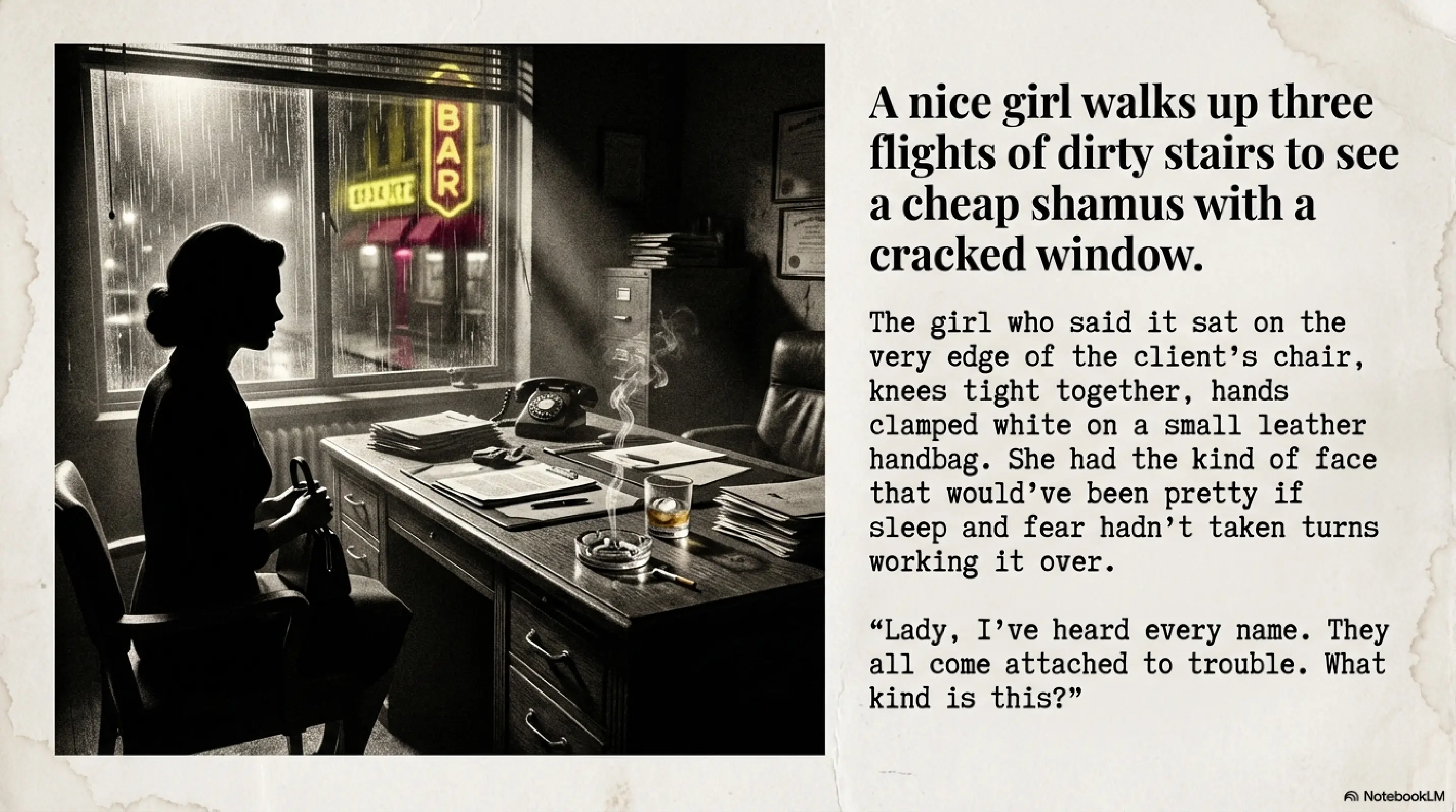“Go back to the beginning,” I said. “And keep it tight. Start with why a nice girl walks up three flights of dirty stairs to see a cheap shamus with a cracked window and a liquor bill he’s on the losing side of.”