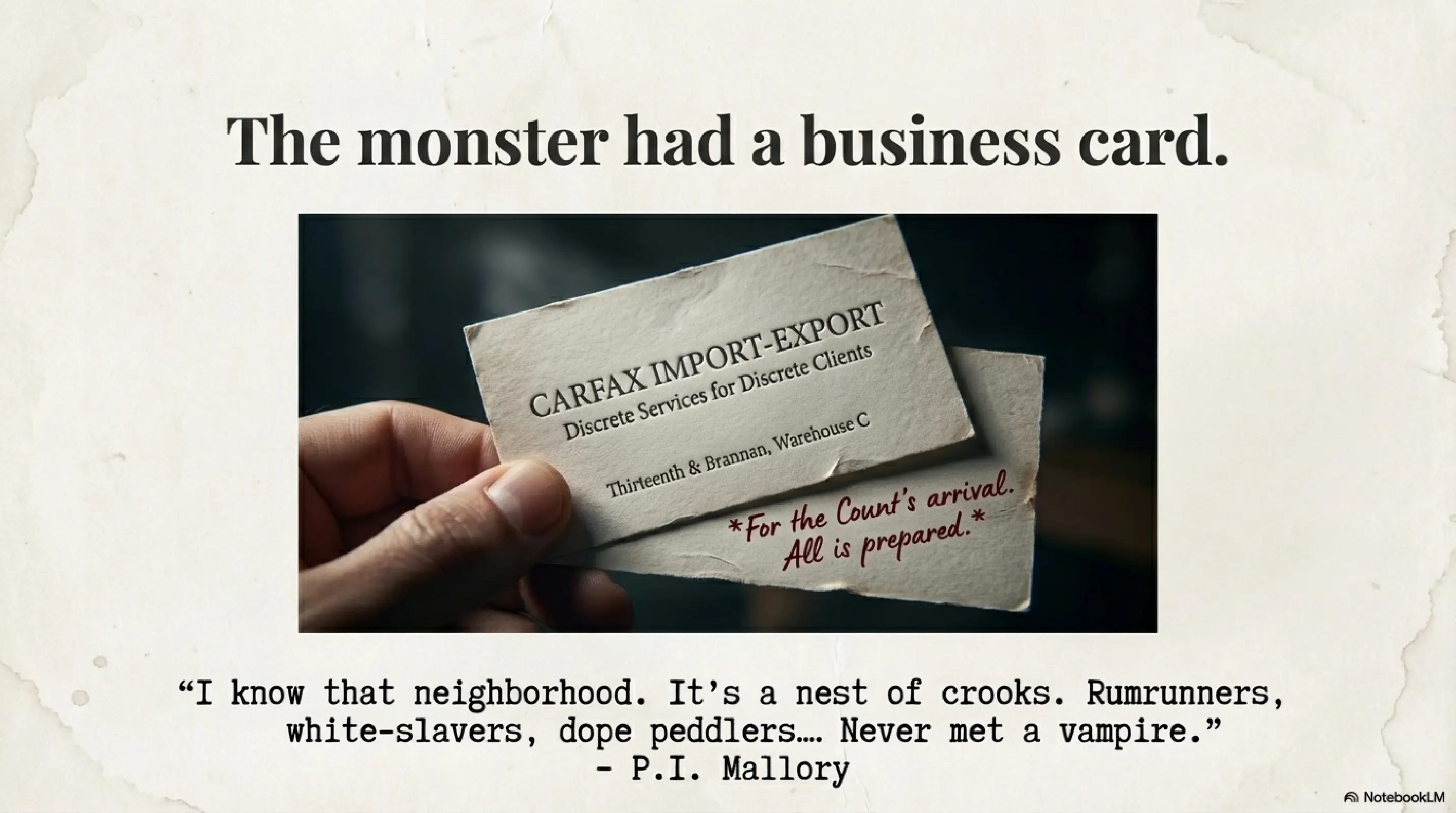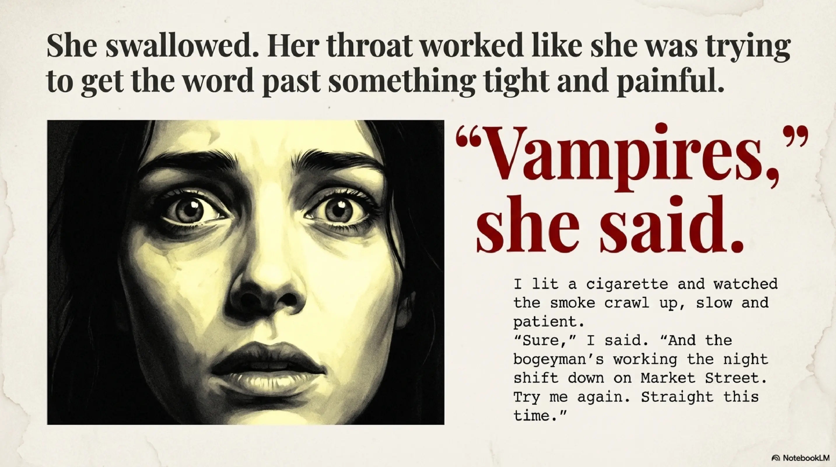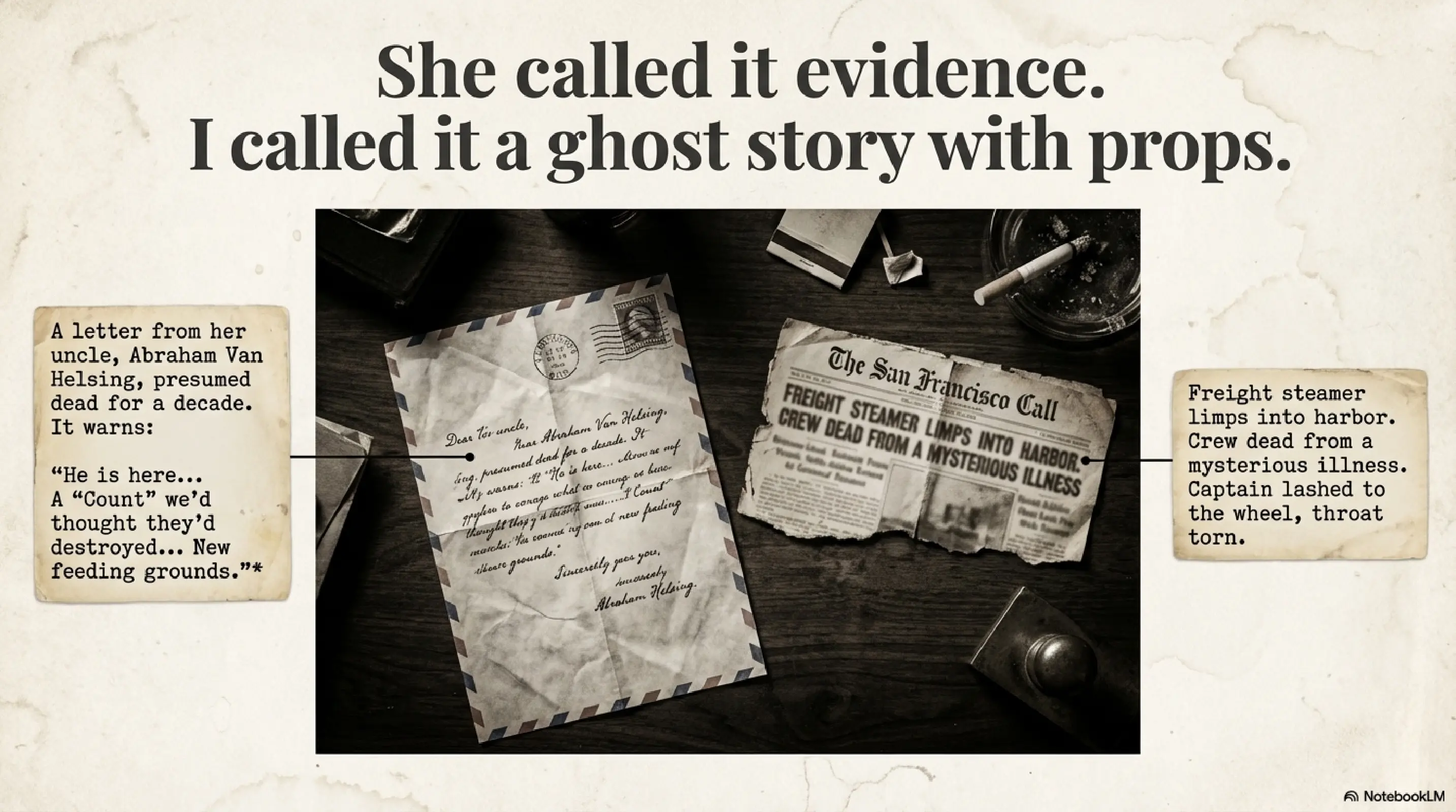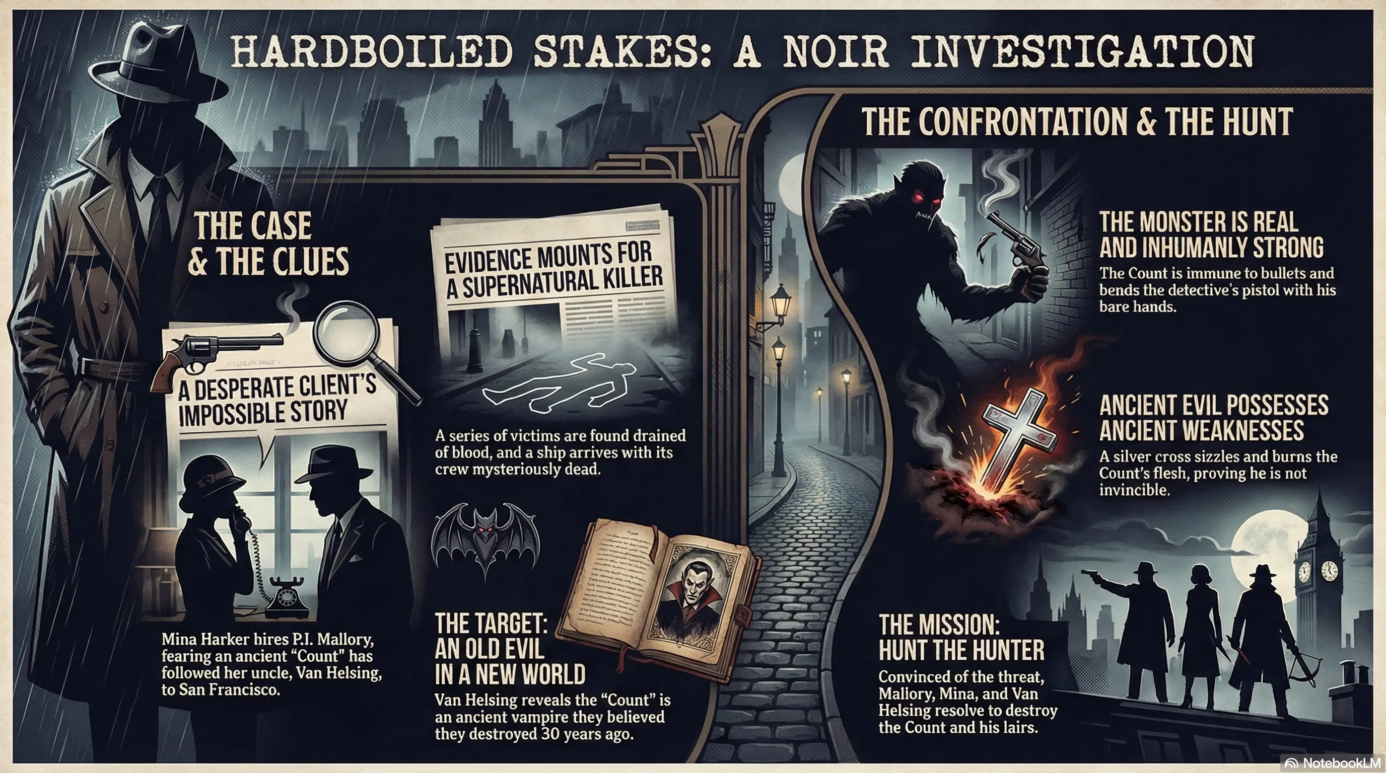 Using ChatGPT 5.1 with high-reasoning mode, I asked it to generate a short story that mixes classic Dracula with a 1920s hardboiled detective atmosphere á la Dashiell Hammett. Afterwards, I fed the material into NotebookLM to produce some media around it — an infographic, slides, and even a bit of analysis.