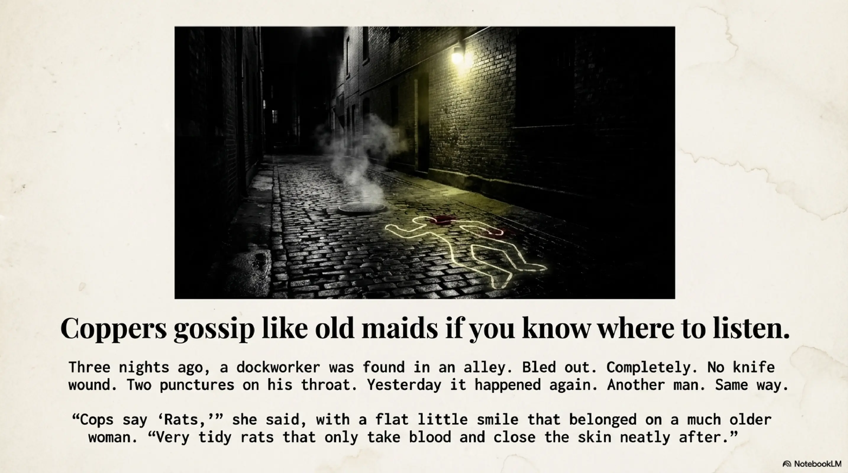 “‘Rats,’” she said, with a flat little smile that belonged on a much older woman. “Very tidy rats that only take blood and close the skin neatly after. Yesterday it happened again. Another man. Same way.”