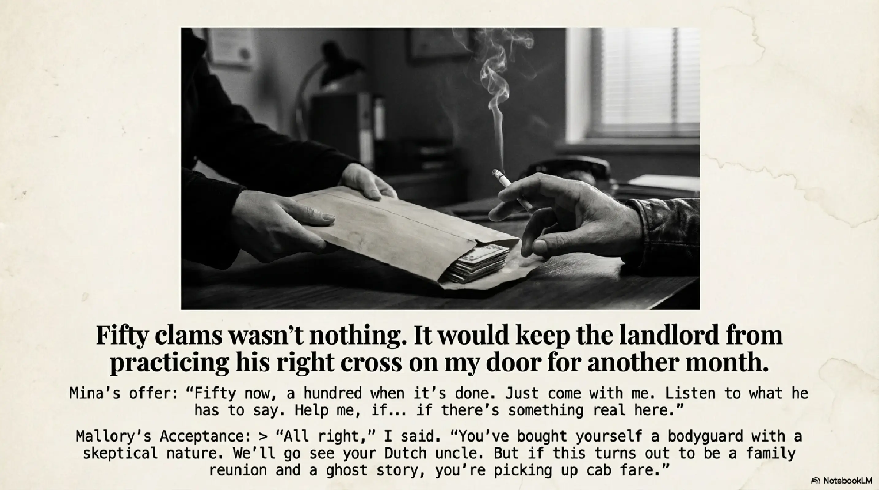 “I can pay you.” She pushed the bag toward me. It thunked with the polite, promising sound of folded bills. “Fifty now, a hundred when it’s done. Just come with me. Listen to what he has to say. Help me, if… if there’s something real here.”