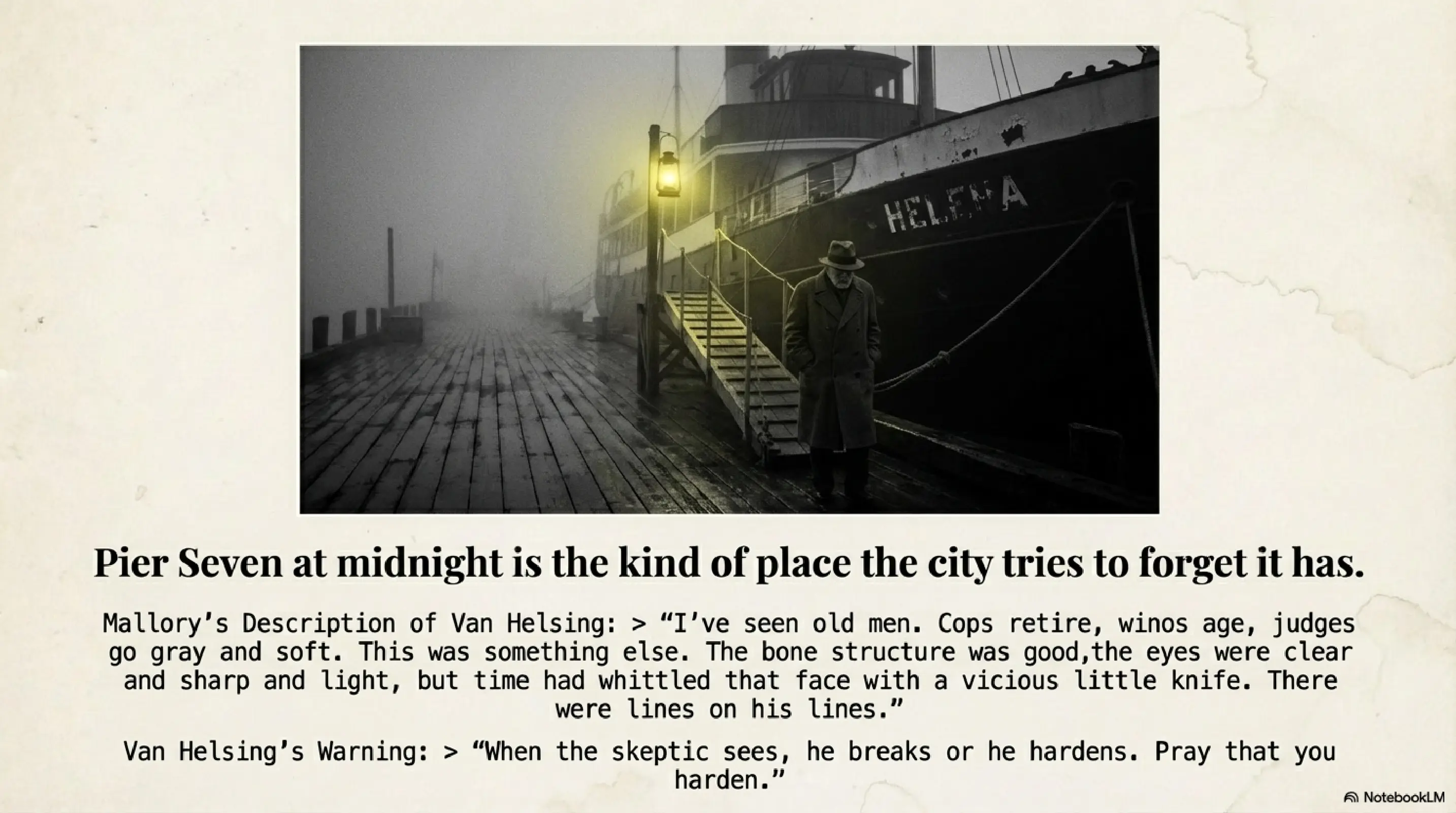 There was one ship tied up near the far end. A small passenger steamer, shabby but clean, with a chipped white hull and a name spray-painted in flaking black on the bow: Helena. There was a single lantern up by the gangway, burning sickly yellow.