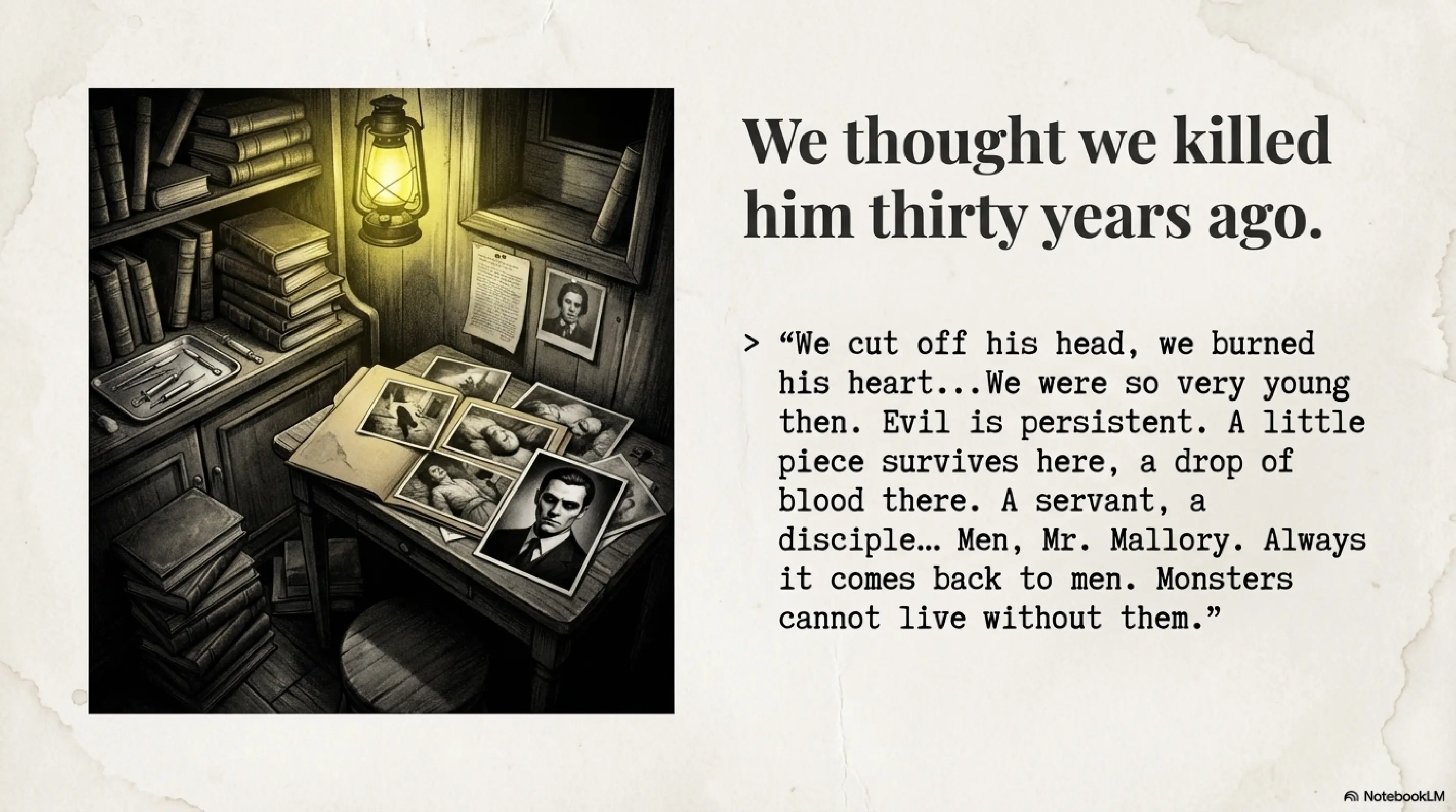 “We thought we killed him thirty years ago,” he said. “We cut off his head, we burned his heart, we filled his mouth with garlic and his grave with holy earth. We were so very young then, even those of us who were already old.” A ghost of bitter humor crossed his face. “Evil is persistent. A little piece survives here, a drop of blood there. A servant, a disciple, someone who thinks, ‘Ah, but what if I keep a bit, yes? What if I sell it, use it, worship it?’ Men, Mr. Mallory. Always it comes back to men. Monsters cannot live without them.”