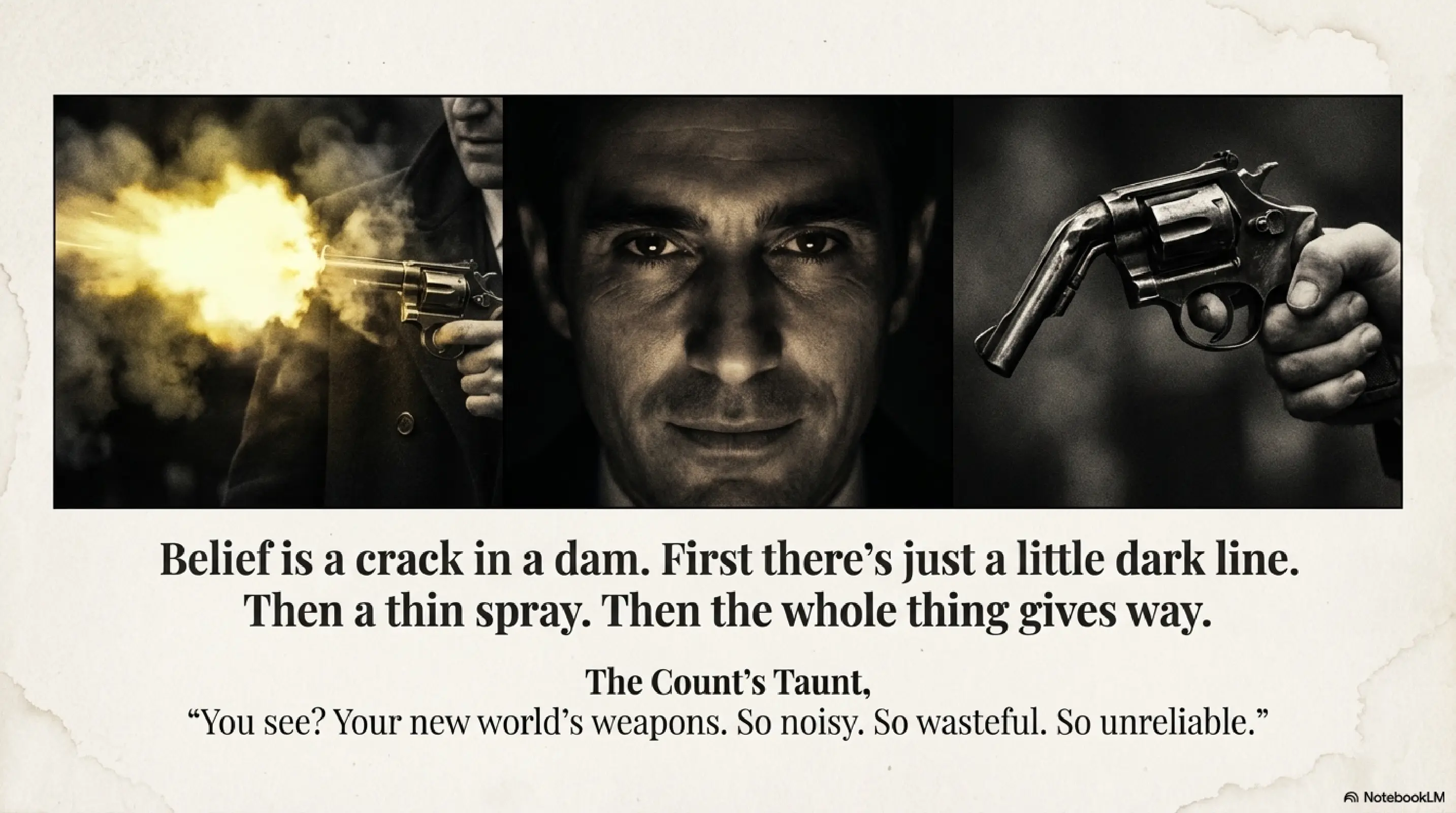 No, that’s not true. The hammer fell. The gun jumped in my hand. But the sound was wrong. Muffled, like firing into a coat. He didn’t jerk, didn’t grunt, didn’t bleed. He just looked at me with a kind of mild amusement, like I’d sneezed at a funeral.