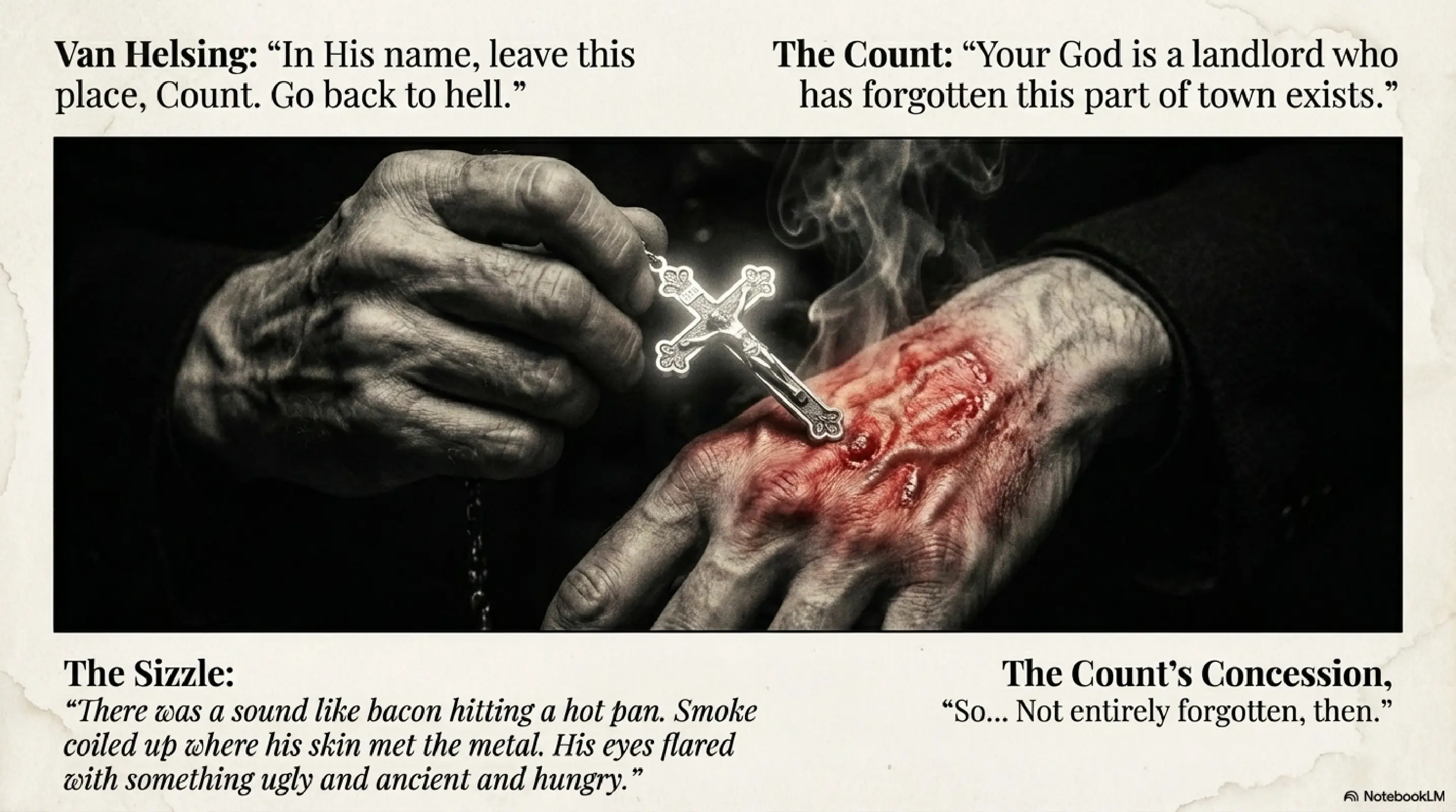 “Some things do not change,” Van Helsing said, voice steady. “The cross is not a toy. It is a sign. You know this, or you would not bother to mock.”