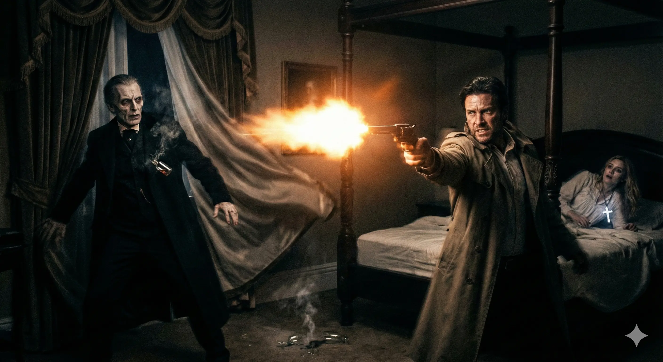 He lifted me. My feet left the ground. The stake slipped from my fingers, clattering uselessly. My gun was pinned between us, barrel pointed somewhere at the ceiling. I scrabbled at his wrist, felt bones under the skin—old, hard, unyielding.