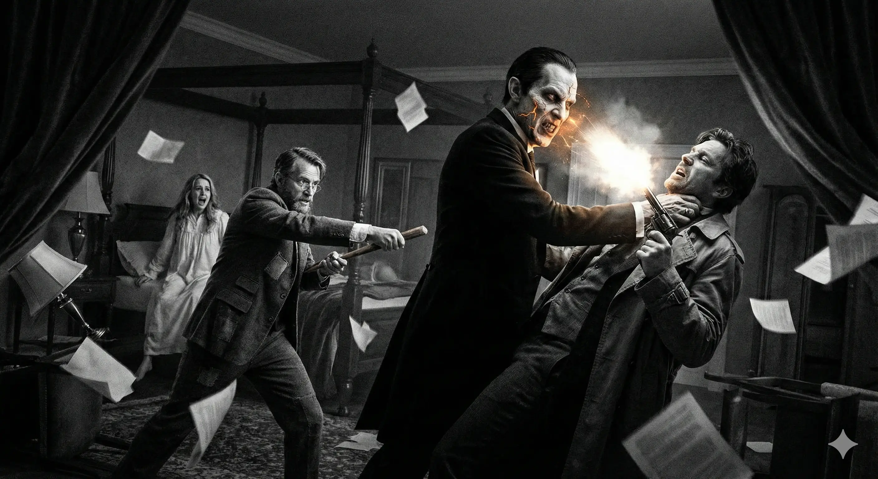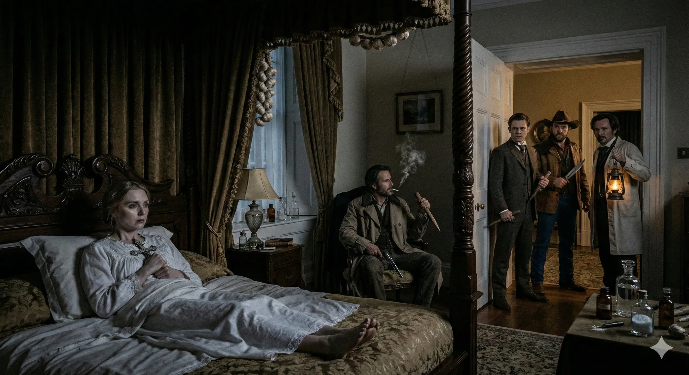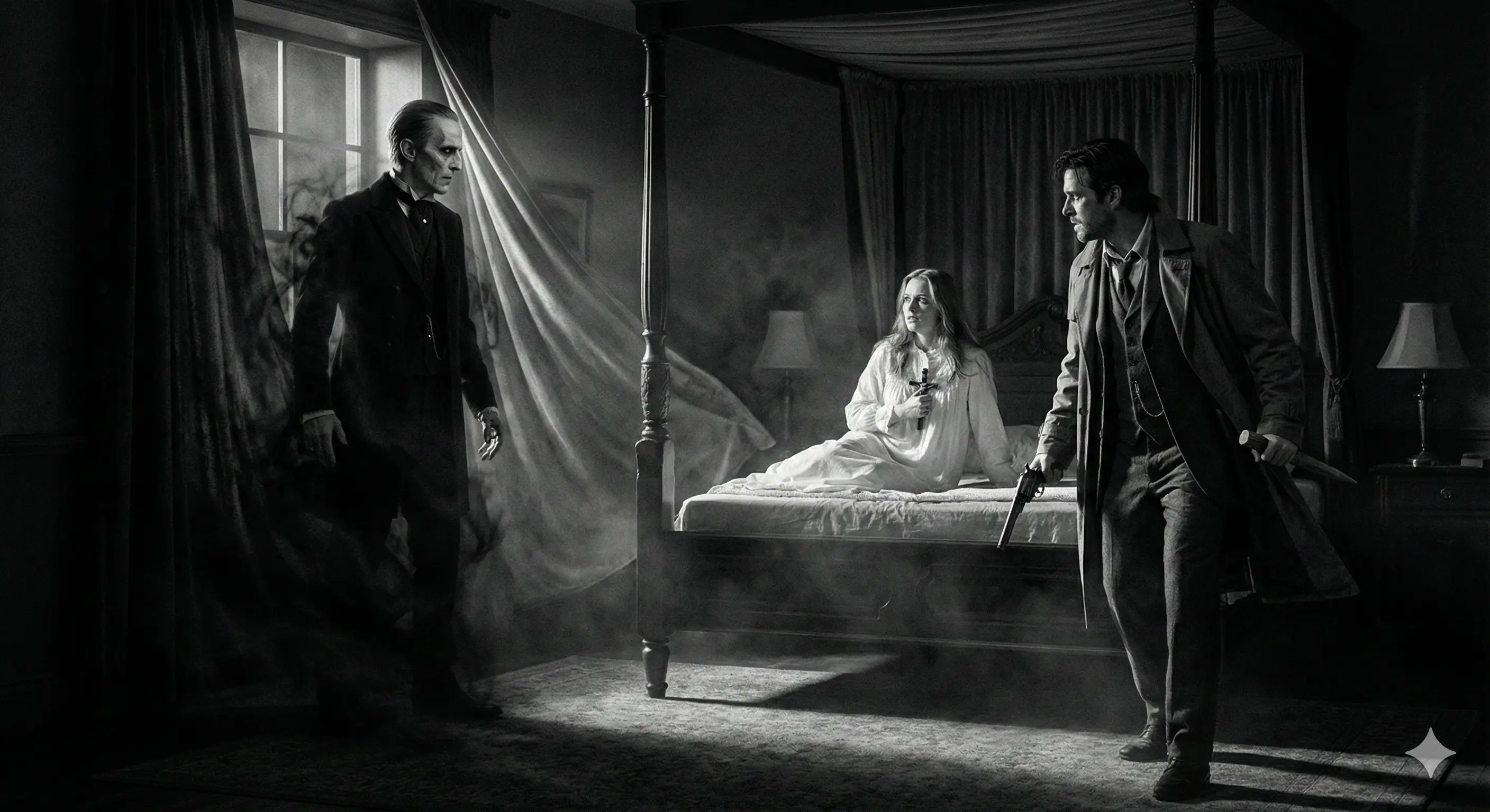 Arthur, Quincy, and Seward waited in the adjoining room, door cracked. Van Helsing sat by the wall like a tired old vulture. I took my chair, stake in one hand, gun in the other. Maybe one of them would matter.