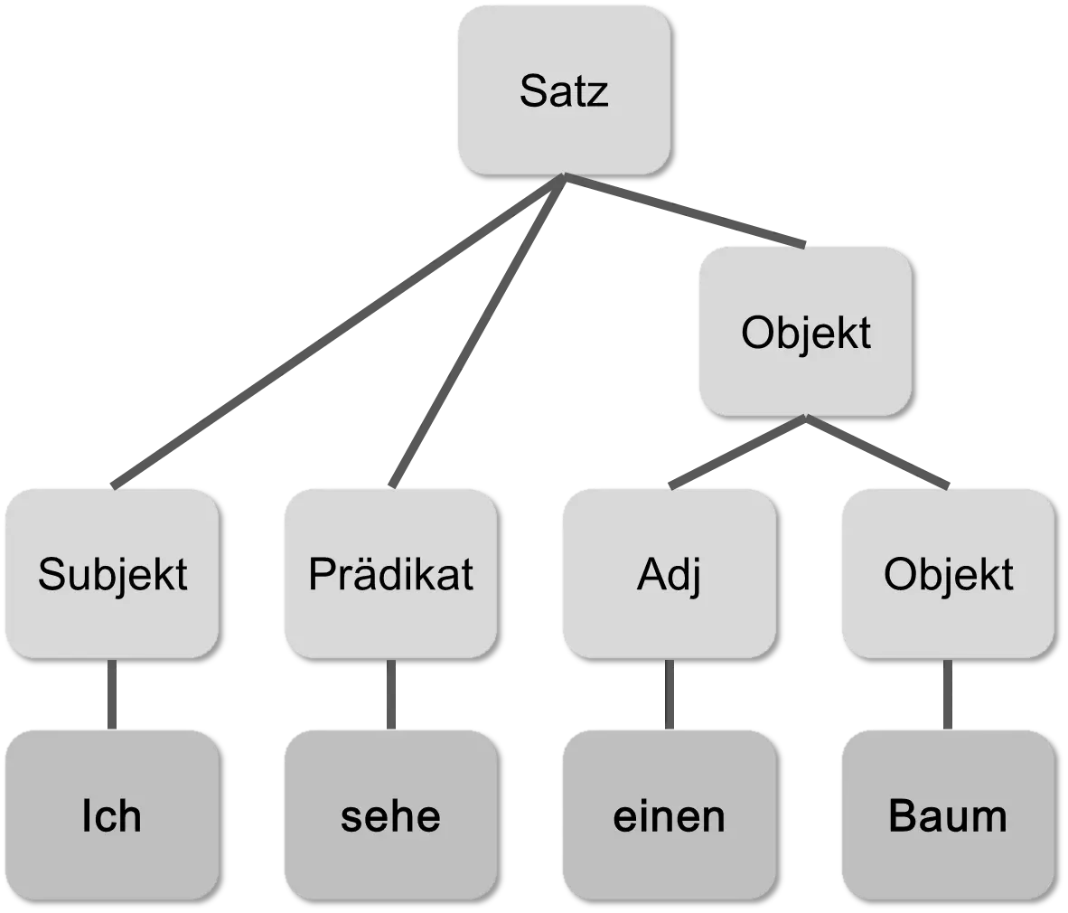 In Schritt 1 wird eine syntaktische Analyse durchgeführt. Manche haben es vielleicht im Schulunterricht gelernt. Der Satz in natürlicher Sprache wird in einen Baum anhand der syntaktischen Kategorien der einzelnen Wörter umgeformt. Als Beispiel wird im Satz „Ich sehe einen Baum“ erkannt, dass dem Subjekt „Ich“ das Prädikat „sehe“ folgt, diesem wiederum das Adjektiv „einen“ und das Objekt „Baum“. Die syntaktische Struktur wird als Baum im Computer gespeichert.