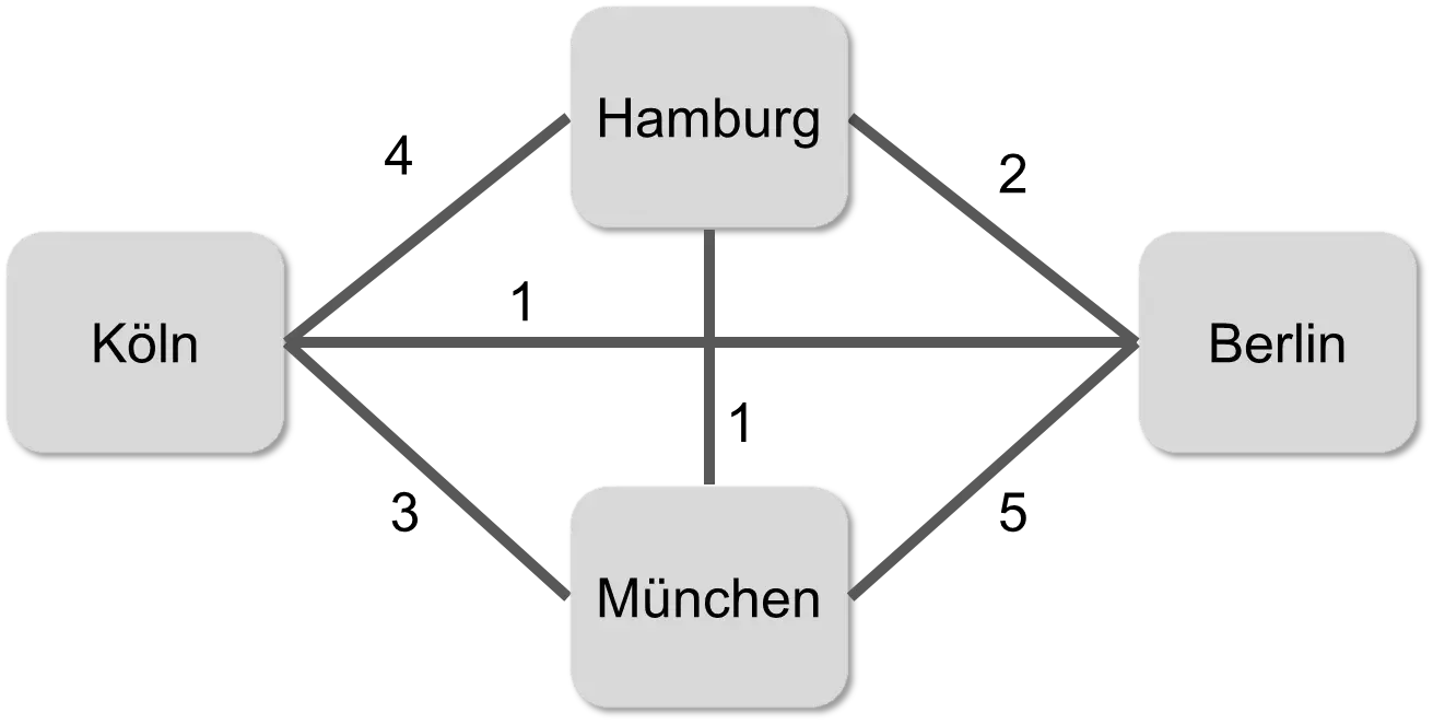 Viele Probleme der Künstlichen Intelligenz ähneln der Suche nach der Nadel im Heuhaufen. Da Computer immer nur eine Sache nach der nächsten machen können, wird der Heuhaufen Strohhalm für Strohhalm durchsucht, bis die Nadel gefunden wurde. Als Beispiel betrachten wir das Problem des Handlungsreisenden („traveling salesman problem“, TSP) [CLRS09]. Eine Musikband will in vier verschiedenen Städten auftreten und plant eine Rundreise, in der sie jede Stadt genau einmal für ein Konzert besuchen will. Die Musiker möchten in Hamburg, Berlin, München und Köln auftreten, sammeln Informationen über die Fahrtkosten und erstellen den folgenden Graphen: