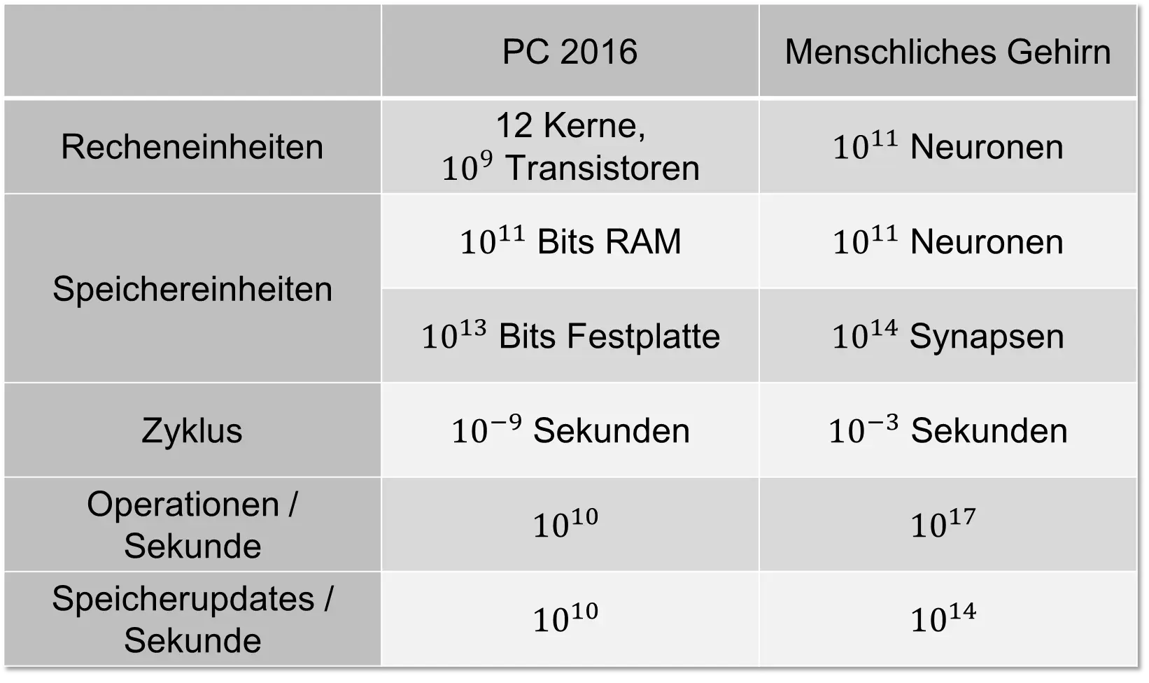 Die folgende Tabelle enthält einen groben Vergleich zwischen einem PC von 2015 und dem menschlichen Gehirn [RN10]2.