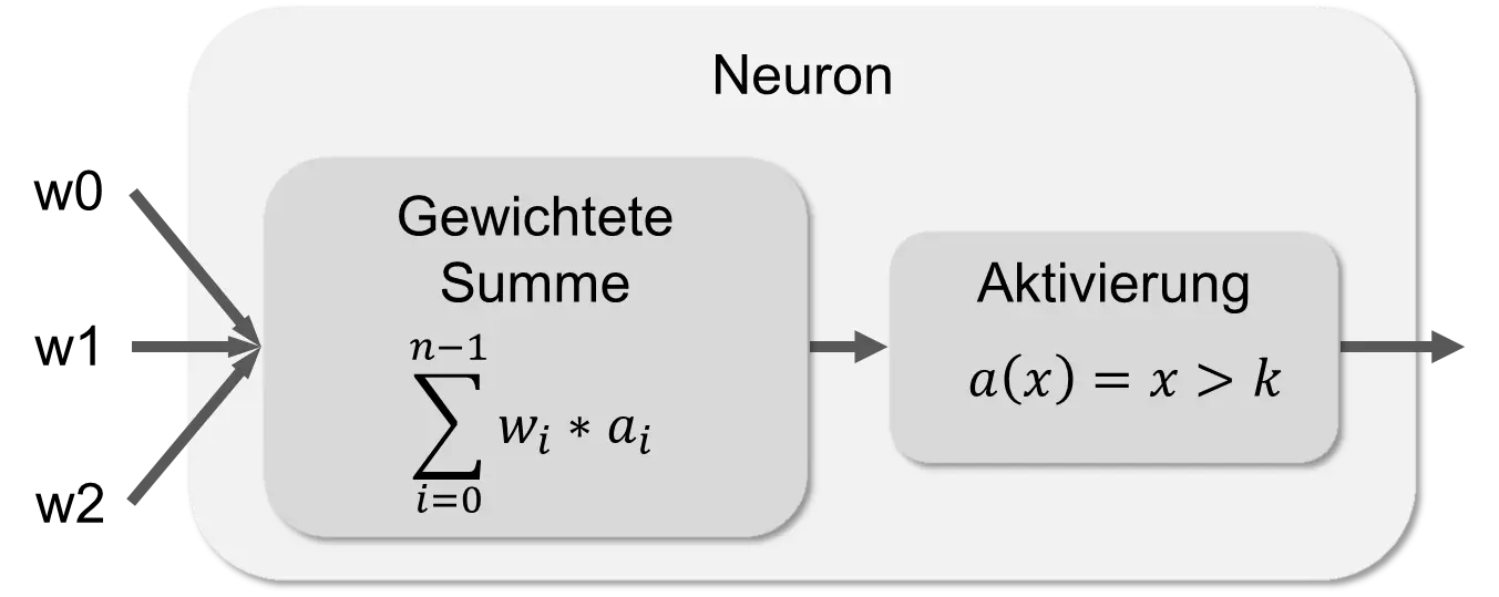 Ein Neuron hat beliebig viele Eingaben, hier in diesem Beispiel sind es drei: w0, w1 und w2. Die Kanten der Eingaben stammen entweder von anderen Neuronen oder von der Eingabe des gesamten Netzes. Jede Kante hat zwei Daten: einen Aktivierungslevel a und ein Gewicht w. Man spricht hier auch von „gewichteten Kanten“. Aus den Eingaben wird in der ersten Komponente des Neurons eine gewichtete Summe berechnet. In der zweiten Komponente wird der ausgehende Aktivierungslevel des Neurons berechnet. In einem Rechenschritt berechnet das Neuron also anhand der Eingaben die gewichtete Summe der Aktivierungssignale und aktiviert sein Ausgangssignal, wenn die Summe größer als ein Schwellwert k ist.