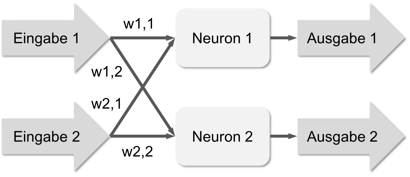 Mit einem solchen Netz kann man verschiedene Funktionen darstellen. Man gibt zwei Eingaben hinein, die Neuronen berechnen anhand der Eingaben und der Gewichte ihre Ausgabe und man kann diese am Ende auslesen. Ein solches Netz ist schon einigermaßen flexibel. Wenn man die Gewichte ändert, ändert sich das Ergebnis des Netzes. Nehmen wir mal an die Gewichte haben die folgenden Werte w1,1=0.4, w1,2=0.2, w2,1=0.6 und w2,2=0.8 und das die Eingabe 1 (e1) gleich 0 ist und die Eingabe 2 (e2) gleich 1. Dann berechnet das Neuron 1 den Wert w1,1*e1 + w2,1*e2 = 0.4*e1+0.6*e2 = 0.6 und das Neuron 2 den Wert w1,2*e1 + w2,2*e2 = 0.2*e1 + 0.8*e2 = 0.8.