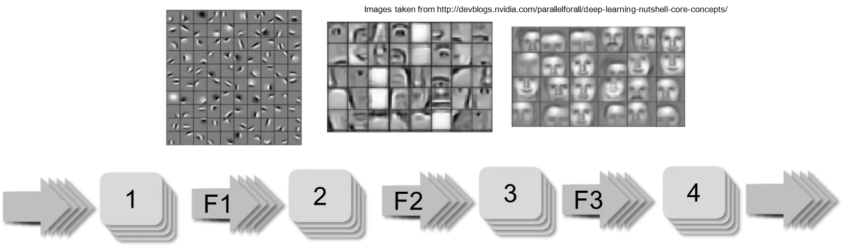 Die Zwischenschichten F1, F2 und F3 speichern „Details“ (im Englischen „features“). In der Realität gibt es Netze mit über 10 Schichten. Diese „tiefen“ Netze können so angeordnet werden, dass sie die selbstfahrenden Autos ermöglichen.