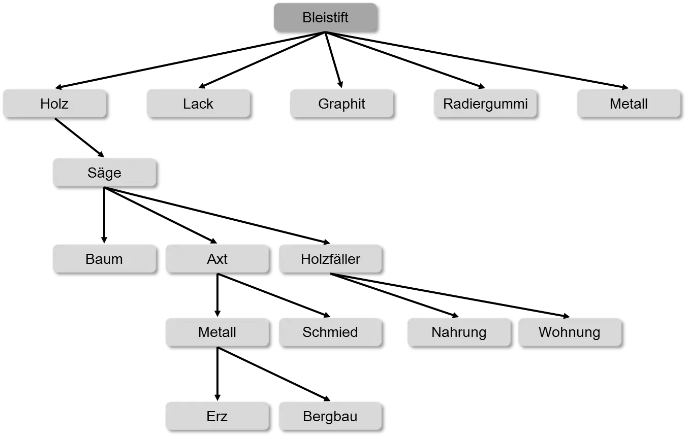 Because they require the products or services of other people to do so. The pencil itself is made of wood, lacquer, graphite, and has an eraser at the top end enclosed by metal. The wood itself is a specific species of tree that must be neither too hard nor too soft. A pencil must be easy to sharpen; if the wood is too hard, that won’t work. The wood comes from a tree felled with an axe or a chainsaw by a logger. Perhaps the wood was transported by truck or rail. The following diagram shows a very small excerpt from the pencil’s “family tree.”