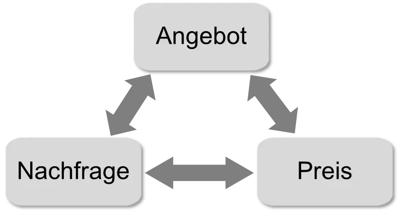Goods are traded in markets: people can offer goods, and others can buy them. A distinction is made between supply (what people want to sell) and demand (what people want to buy). There is a connection, a dependency, between supply, demand, and prices. They are not independent variables but influence each other. This relationship between supply, demand, and price was discovered earlier in the “Classical Period” of economics from 1680–1830 [Bei07]. It is also covered in mainstream textbooks, such as Paul Krugman and Robin Wells [KW05]. The following diagram outlines these mutual interactions: