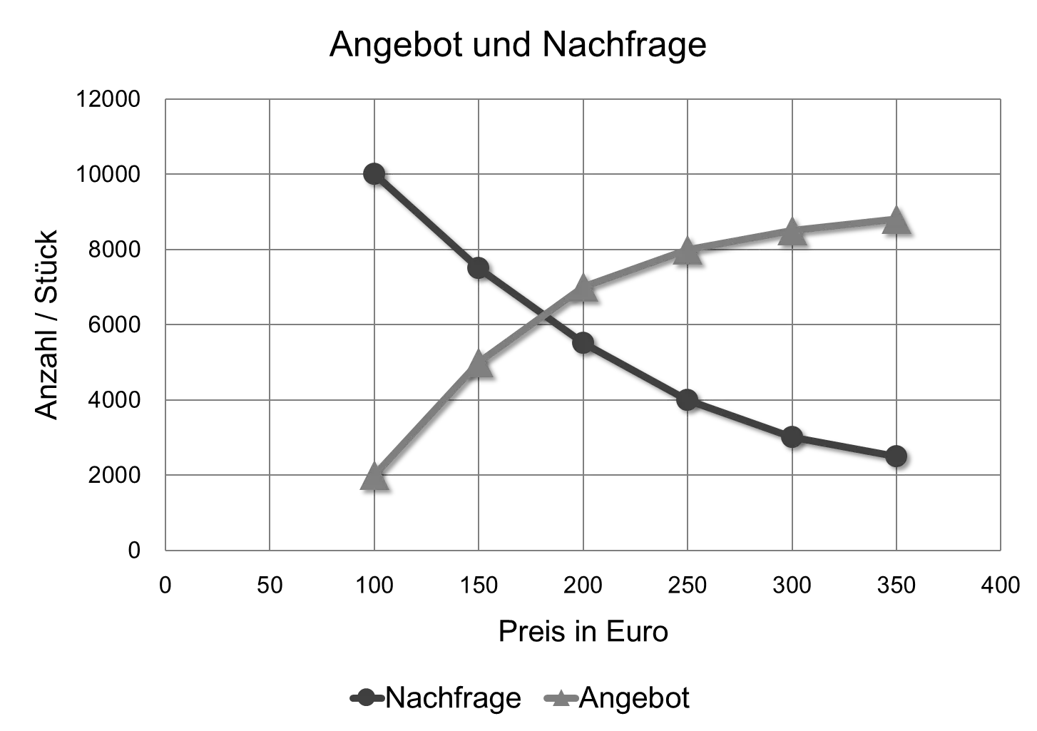 Two curves are drawn here: supply and demand. On the horizontal x-axis is the price in Euros; on the vertical y-axis is the quantity.