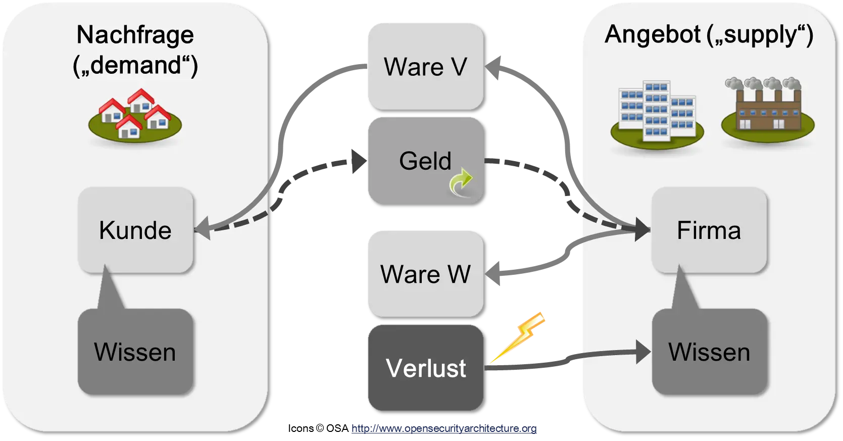 The economy is divided into two sides: demand and supply. Demand refers to all customers and buyers of goods and services. Supply includes all companies. In the figure, a company offers two different goods, V and W. Good V is bought by a customer who pays for it with money. The customer and the company thus exchange money for good V. The company gains the information that good V is useful. It also knows now that good W is not needed. The company’s knowledge has increased. A company’s knowledge can be illustrated in a kind of learning curve. For the company, launching the two goods was an experiment, a test. The top product passed the test; the bottom one did not. The company thus receives both a financial reward and valuable information. For George Gilder, it is an essential element of the market economy that these two types of information—the financial reward and the knowledge of how to produce the product—remain together within an organization. The one who earns the money should also be the one who reinvests it. This makes a repeat success more likely [Gil13].