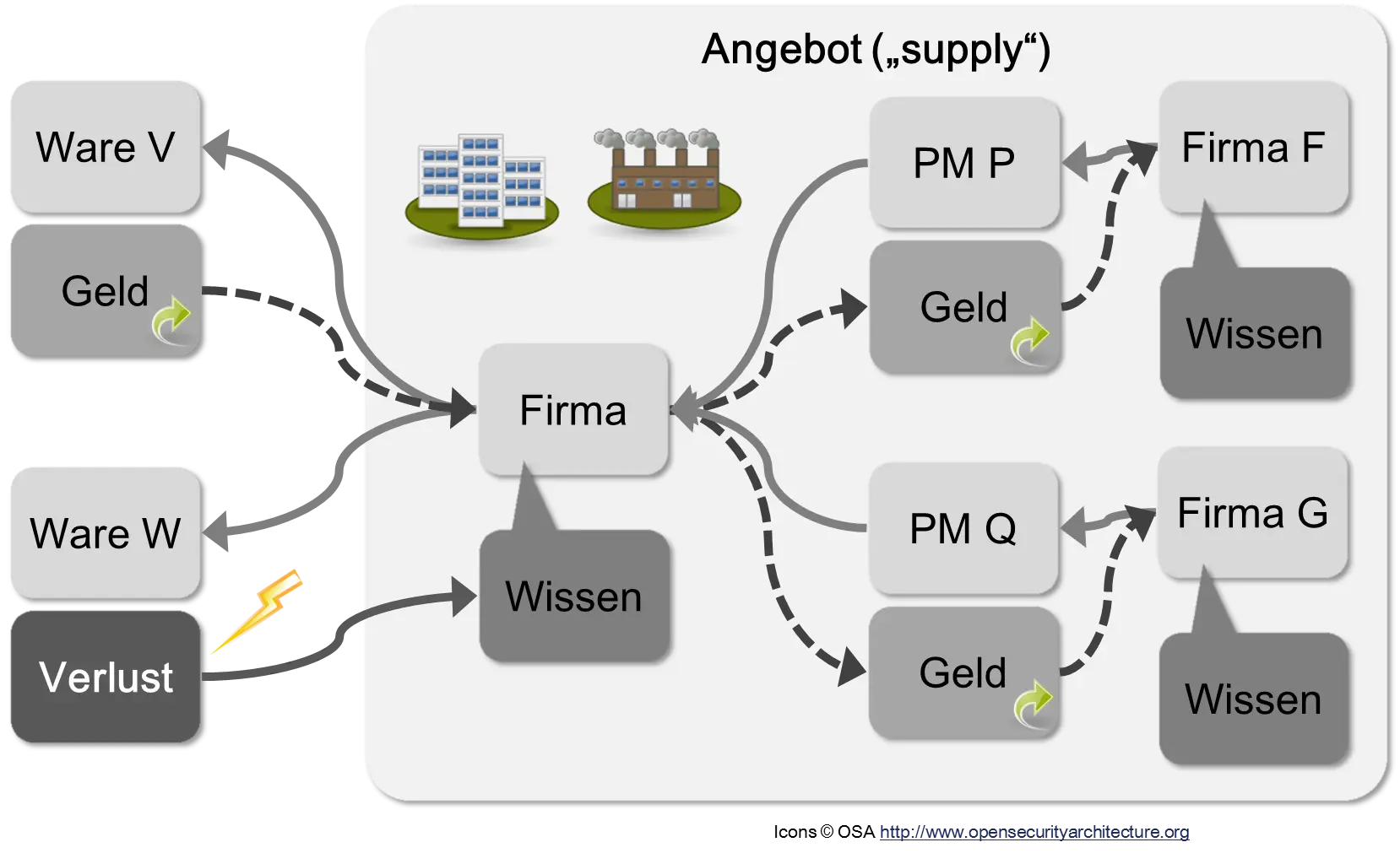 Now company F has used means of production P to produce V. Who decides how long P is used and when it is replaced by a newer means of production? If sold at the right time, money can perhaps still be made with it. If it breaks, it is repaired or replaced. These decisions are made decentrally in an economy where the means of production are privately owned—every company decides for itself. Whether the company can produce at all is decided by the customers who buy the product.