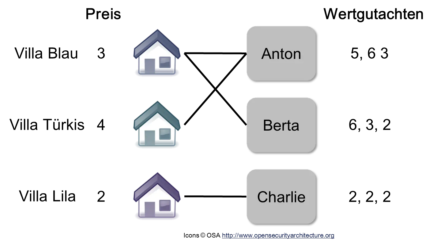 Thus, the new problem is traced back to the known bipartite matching problem from the previous example. It is a common technique in computer science to trace new problems back to known problems for which a solution method already exists. An optimal solution for a “matching” is called a market equilibrium (“market clearing price”). In this case, Anton buys the Turquoise Villa, Berta the Blue Villa, and Charlie the Purple Villa.