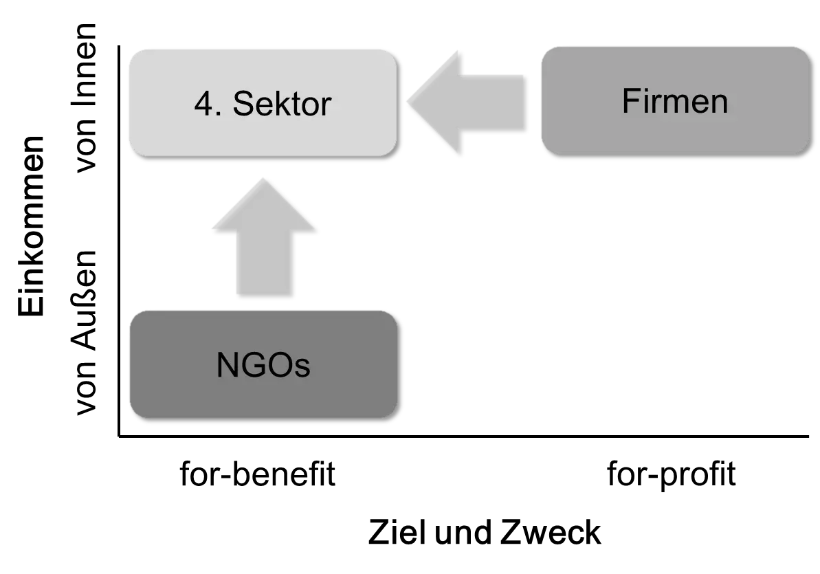 The so-called “fourth sector” (the first sector is the state and is not shown in the diagram) consists of “for-benefit” companies that generate their own income—meaning they are profit-oriented but not profit-maximizing1. They are a mixture of NGO and company that aims to combine the advantages of both. Such a “for-benefit” company must legally commit explicitly to the goals to be achieved. Examples of such goals are “production of a drug that 95% of the population can afford” or “internet access for 99% of people.”