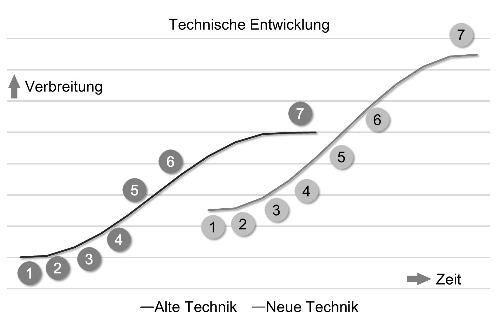 In the diagram, a new technology replaces an older one. The development has the following phases [Kur06]: